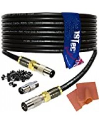 1STec 10m Câble de télévision numérique RG6 Noir haute performance Avec adaptateurs coaxiaux mâles ou femelles et connecteurs de compression F Conçu pour la TV terrestre ou par satellite (10 mètres)