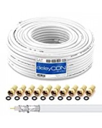 deleyCON 100m HQ Câble Coaxial Satellite Sat 130dB Blindé 4 Couches DVB-S DVB-S2 DVB-T DVB-C 4K 1080p Full HD HDTV + 10 Connecteurs F Plaqués Or