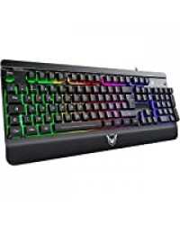 PICTEK Clavier Gamer AZERTY Clavier Gaming Métallique avec Rétroéclairage LED, Clavier USB Ultra Mince, Avec Repose-Poignet- Commandes Multiméd, pour PS4, Mac Xbox PC Bureau, Jeux,【Version 2020】