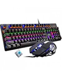 Clavier de Jeu mécanique Filaire Commutateur Bleu 104 Touches RVB Rainbow LED 9 Modes de rétroéclairage Disposition des clés Ergonomique étanche USB pour Les Joueurs dactylographes (Noir)